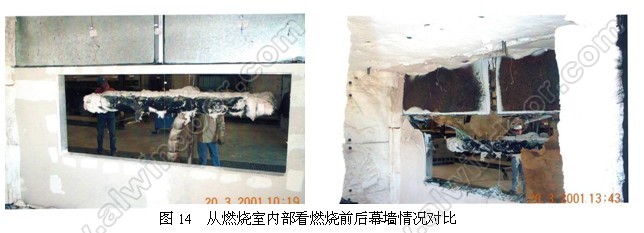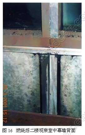 破裂現象。注意到為什么開口處上部橫梁都熔化掉了,但單層玻璃不掉下來呢?這是一個半隱框系統,玻璃四周全部用結構硅膠,由于定位玻璃的EPDM橡膠塊已失效,所以應該是結構硅膠在起作用。 結構硅膠在高溫下到底起多大作用?這個問題有待研究,在這個試驗中至少還能保持住單層玻璃2個小時。窗間墻玻璃的破碎和