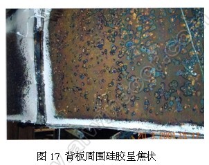 連接件已分開了(圖16)。一樓燃燒室內部背板周圍的密封硅膠均已燒成白色的焦狀物。(圖17)