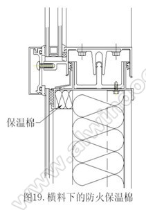 3) 橫料下防火保溫棉:這里的防火保溫棉厚度根據建筑物和幕墻系統具體情況具體設計,能夠保證50mm以上最好,至少要有25mm(圖19)。