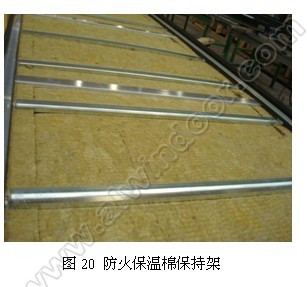 防火保溫棉必須采用機械式固定方式牢牢地固定在鍍鋅鋼板背板上。圖20中,防火保溫棉先用膠水粘在背板上,再用鍍鋅鋼板保持架壓在防火保溫棉的表面,保持架二頭用