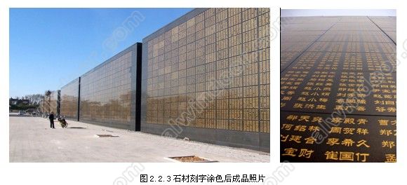 2)、涂金色字,在設計初期對凹字沒有涂色的要求,是采用黑色石材經雕刻后的毛面色差來襯托出字體,加重每個字的滄桑感.但由于在刻字上墻后在高處的字不明顯,站在墻下看不清字。最后決定涂金色增加字體與底黑色的反差,使設在高處的字體也清晰可見。