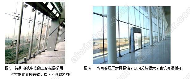 建筑師選用點支玻璃幕墻,尤其是選用索網(wǎng)玻璃幕墻,都是為了盡量通透,不希望增加一點遮擋。哪怕是一根細細的欄桿,往往建筑師都無法接受。所以點支和索網(wǎng)玻璃幕墻在地面或者樓面處常常不讓設置欄桿。只要玻璃采用了夾膠,不可能飛散,我們就可以同意這個要求,為建筑功能和建筑藝術創(chuàng)造更好的條件(圖5、圖6)。