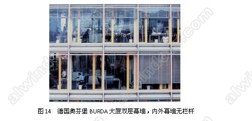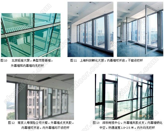 玻璃門也不可能設個妨礙交通的欄桿(圖10~圖14)。不只國內(nèi)的雙層幕墻工程,許多國外的工程也同樣是內(nèi)外幕墻均不設欄桿。