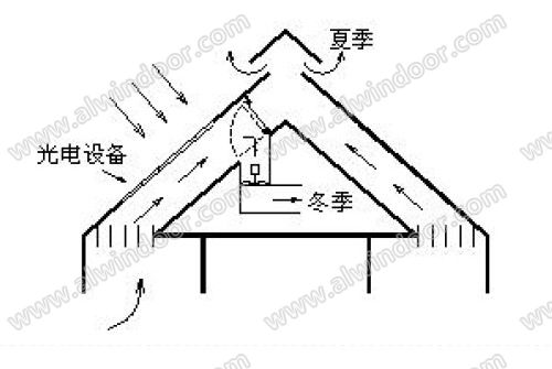 通風(fēng)系統(tǒng)。光電板安裝在屋頂,在外層光電板下部留下一定量的空氣層以供設(shè)備降溫,同時冬天可以收集熱空氣采暖。