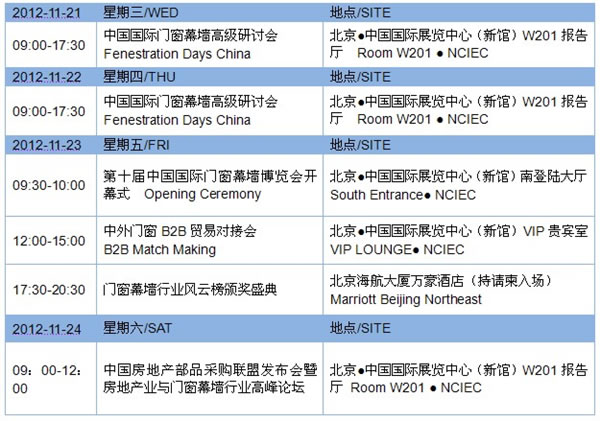 展會名稱:Fenestration China 2012第十屆中國國際門窗幕墻博覽會 時間: 2012年11月23-25日 地點:北京•中國國際展覽中心(新館) 展會規模:55,000 平米(預計) 參觀觀眾:46,000 專業觀眾(預計) 主辦單位:中國建筑金屬結構協會 歐洲門窗協會 承辦單位:北京中德建聯國際會展有限公司 中國建筑金屬結構協會于2012年10月發布關于“2012第十屆中國國際門窗幕墻博覽會”延期的發文: 接上級指示,黨的十八大將于2012年11月8日在北京舉行,因此原定于2012年11月8-10日在北京•中國國際展覽中心(新館)舉辦的第十屆中國國際門窗幕墻博覽會將順延到2012年11月23-25日舉行。 發文全文請訪問博覽會官方網站閱讀:http://www.fenestration.com.cn/main/newsContent.jsp?intNC_ID=25923&intNS_ID=1057 新的時間安排 1.觀眾參觀時間: 2012年11月23日(周五)09:30-10:00 博覽會開幕式 09:00-16:30 觀眾進場參觀 2012年11月24日(周六)09:00-16:30 觀眾進場參觀 2012年11月25日(周日)09:00-16:00 觀眾進場參觀 2.各項配套活動時間