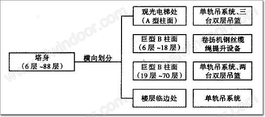 根據安裝原則,對整個幕墻進行合理劃分,豎向總體分為塔身(6層~88層)和塔頂(89層~屋頂)兩部分;塔身橫向根據建筑物臨邊有無實體墻面和單元板塊的形狀劃分為4個部分,即觀光電梯A柱面處、巨型B柱面6~18層(該處單元板是整片