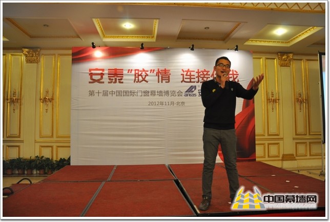 鄒總致辭后,易總監(jiān)上臺發(fā)表《安泰 同享豐盛 共創(chuàng)輝煌》的演講:安泰的品牌“承諾”始于1988年,目前公司已擁有5個生產(chǎn)基地包括神崗精細化工基地、科學城光泰工廠基地、廣州高塘涂料廠基地、河北大成工廠基地和增城工廠基地。在廣州、上海、北京、杭州、成都、深圳等地已成立27家分公司或辦事處。公司現(xiàn)主營四大業(yè)務包括安泰建筑膠、水性多功能漆、水性防腐漆、集裝箱密封膠等,其中建筑密封膠連續(xù)7年成為中國幕墻網(wǎng)用戶選擇國內(nèi)前三排名,在市場表現(xiàn)中安泰膠的市場占有率為17%,在調(diào)查活動中穩(wěn)居國內(nèi)品牌前列。“十二五”安泰發(fā)展戰(zhàn)略,建成年產(chǎn)值過30億元,占地200畝的安泰產(chǎn)業(yè)園。確立并保持在行業(yè)中的領(lǐng)航地位。安泰堅持以高品質(zhì)的密封膠作為市場定位,以專業(yè)化的團隊做好售前、售中、售后服務,以專業(yè)精神確定并保持在行業(yè)中的領(lǐng)航地位。安泰化學“實實在在的產(chǎn)品,安安心心的選擇!”