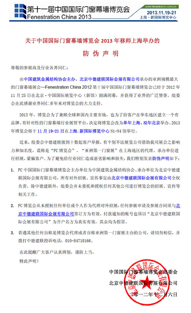 關(guān)于中國(guó)國(guó)際門(mén)窗幕墻博覽會(huì)2013年移師上海舉辦的防偽聲明
