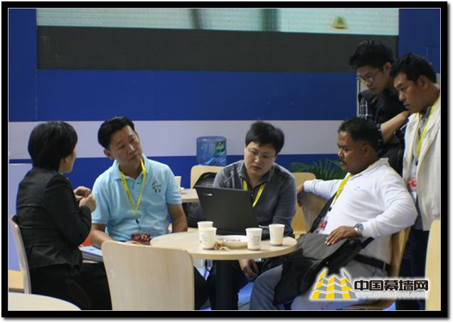 公司技術劉總監與國貿部李總在展會現場與外商會談