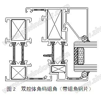 如圖2所示,采用的是雙腔體組角角碼的形式,比單一腔體在組角強度上更有保證,同時型材角部雙相約束,保證組裝成品窗時的穩定性。