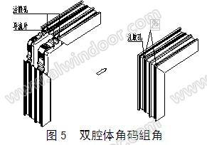 如圖5所示,在鋁合金角碼的兩側附加導流片,組角后,門窗角部預留的注膠孔注入組角膠,這樣不僅增加了門窗角部的強度,而且還使門窗角部的密封性能得到提高,此種組角工藝應為門窗角部加工的首選。