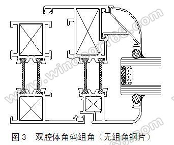 如圖2所示,采用的是雙腔體組角角碼的形式,比單一腔體在組角強度上更有保證,同時型材角部雙相約束,保證組裝成品窗時的穩定性。