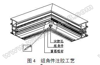 門窗角部懸臂部分采用尼龍注塑件的形式,對角部起到鎖緊和控制高低差的作用(常規組角鋼片只能起到控制高低差的作用);安裝后可以在預留的注膠孔注膠,使密封的效果更好。如圖4所示。