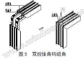 如圖5所示,在鋁合金角碼的兩側附加導流片,組角后,門窗角部預留的注膠孔注入組角膠,這樣不僅增加了門窗角部的強度,而且還使門窗角部的密封性能得到提高,此種組角工藝應為門窗角部加工的首選。