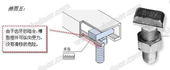 由于鋁合金豎向大裝飾線條懸挑300mm,在側向風壓作用下,側向風壓傳力給裝飾線條,裝飾線條傳力給單元板塊,而單元板塊通過轉接件系統傳力給混凝土結構,而由于單元板塊與混凝土結構間通過槽型埋件接,因此,當側向風壓較大時,會導致單元板塊相對于混凝土結構產生側向滑移現象,進而對整個幕墻系統的結構安全產生影響。因此,我們在通過反復計算研究后,通過對槽型預埋件進行帶齒加工處理,同時對T型螺栓也進行了帶齒加工(詳插圖五)。帶齒T型螺栓與帶齒槽型預埋件間通過齒牙進行緊密嚙合,可以使槽型預埋件縱向受力,這樣確保帶鋁合金裝飾線條的單元板塊在側向風壓作用下,與主體結構間不會產生相對滑移的危險。