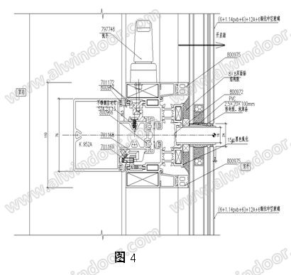 該套幕墻系統的開啟窗是亮點,如圖3、圖4所示,在硅谷亮城項目上,幕墻的分格是2100×975mm,板塊比較重,采用承重比較大的重型五連桿;開啟扇處的邊框與固定扇部位的邊框一模一樣,外視內視效果相當簡潔,美觀;開啟扇框采用隔熱型材,采用四道膠條進行密封,所以該處的隔熱性能、水密性能、氣密性能,基本接近固定扇部位的性能;開啟扇的底邊和頂邊框分別有三個鎖點,在開啟扇關閉時,六個鎖點把開啟扇扣得相當緊密,保證幕墻的各項性能。