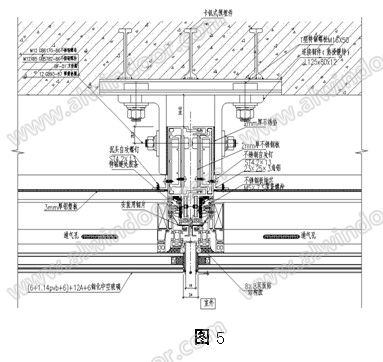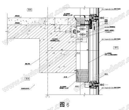 該套半單元式幕墻框架系統安裝與普通玻璃幕墻基本相同,安裝節點如圖5、圖6所示,埋件用卡釩式