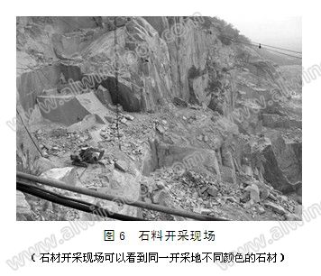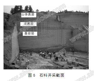 石料開采坑口分三個層次,每個層次石材是不一樣的。但是過渡層與基巖層而是沒有明顯接線可分的。見圖5。