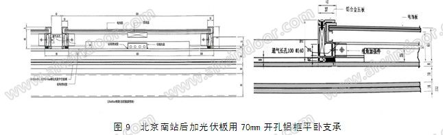 圖9為北京南站的光伏屋面,原為合一式,光伏組件位于中空玻璃的空腔內。由于通風不良,組件溫度升至很高,光伏板失效,必須改建。改建時在原光伏板的正上方,中空玻璃之上設置新的光伏板,位置與尺寸和原光伏板完全相同。新光伏板成為兩層皮的分離式,由70mm截面高度的鋁合金框平臥支承,鋁合金型材有 100mm 的長圓孔,間距140mm,以利于通風降溫。