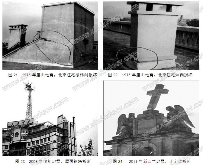 歷次地震中,突出屋面小附屬結(jié)構(gòu)的震害是較為普遍的(圖21~圖24)。屋面光伏系統(tǒng)不僅是小附屬結(jié)構(gòu),而且它的剛度比樓梯間、電梯間等一般的附屬結(jié)構(gòu)還要小,其鞭梢效應(yīng)更為嚴(yán)重,抗震設(shè)計(jì)時要更為重視(圖25)。