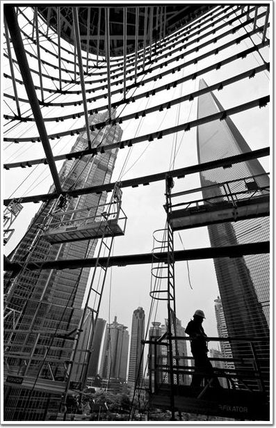 工人在上海中心大廈8層挑高中庭進行外幕墻吊裝施工