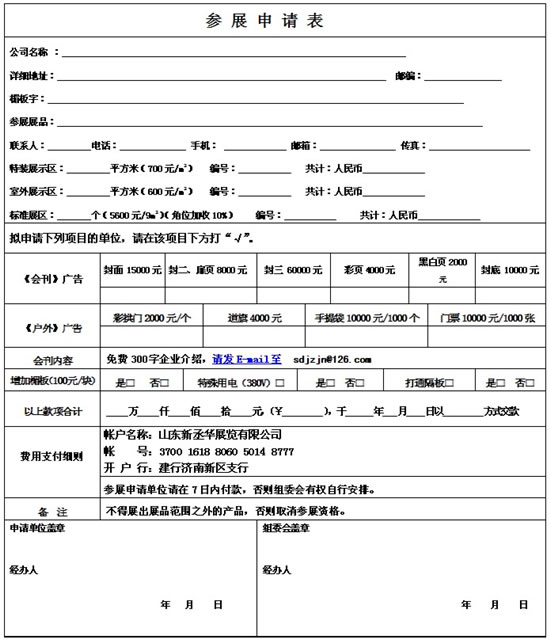 (備注:光地36m2起租,2000元展覽館押金,水電費另行交納;標展包括三面展板、一桌兩椅、兩盞射燈、楣板一條、220V電源(僅限于照明),會刊300字企業(yè)簡介)