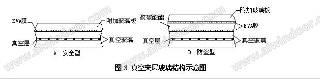 圖3所示的是單面夾層結構,也可以做成雙面夾層結構, EVA膜(也稱EN膜)厚度約為0.4和0.7mm兩種。聚碳酸酯板厚度約為1.2mm。附加玻璃板在2.5mm到5mm之間選用,也可用鋼化玻璃。其特點是安全性和防盜性,同時其傳熱系數、隔聲及抗風壓等性能也優于真空玻璃原片,總厚度也比較薄。由于玻璃和夾膠層的熱導較大,對熱阻貢獻較小,因而真空夾層玻璃的傳熱系數只比真空玻璃略小,但隔聲性能會有較大提高。