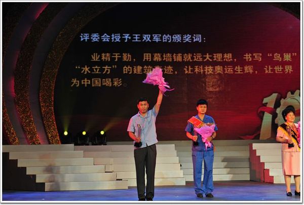 頒獎過程中,主持人黃曉娟對王雙軍說:“您看,您的名字和您取得的成績就聯系得非常緊密,‘雙軍’、‘雙軍’代表‘鳥巢’、‘水立方’雙個冠軍。”王雙軍笑語:“您過獎了,我還是第一次聽到有人這樣解讀我的名字,很感謝您。不過我是這樣認為的,目前僅僅兩項冠軍還遠遠不夠,我們沈陽遠大的目標是要拿更多個冠軍,帶給沈陽,帶給鐵西的家鄉父老,為鐵西的百萬市民爭光。所謂追求無止境,發展也就無止境,您說是吧?”主持人說:“您講的太對了,我們鐵西確實需要有遠大這樣世界級的企業,希望遠大把更多的冠軍帶回鐵西!”