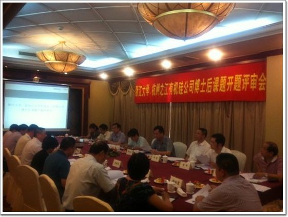 杭州之江有機(jī)硅化工有限公司博士后開題評審會在蕭山賓館舉行。出席評審會的有:浙江大學(xué)黨委副書記鄭強(qiáng)教授、浙江大學(xué)化工系主任王彥廣教授、浙江大學(xué)博士后管理辦公室主任趙雪珍主任、浙江大學(xué)高分子系宋義虎教授、省人社廳專技處許初長、蕭山區(qū)人社局副局長何宣及相關(guān)主任科員。之江公司董事長