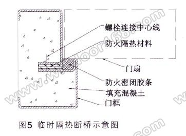 ① 采用臨時性隔熱斷橋,需要使用螺栓連接,其框上的螺栓很難加工。組裝前要在內層門框、外層門框和防火板上分別加工多個孔,其中自一組孔沒對正,就會自螺栓穿不過去。在螺接組裝過程中不能打孔,門框的內部空間很小。