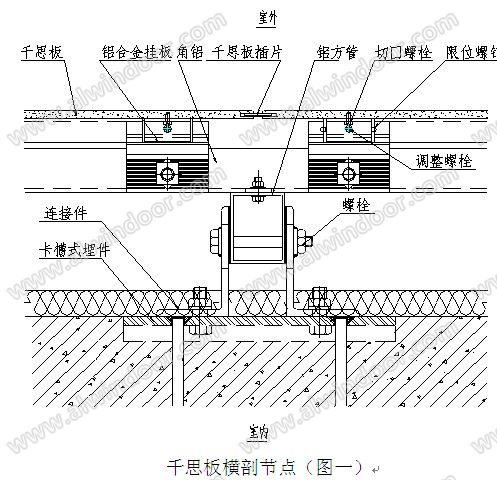 型材用量較高。板塊上掛點(diǎn)一側(cè)設(shè)限位螺釘,另一側(cè)為自由端,既保證板塊準(zhǔn)確定位,又保證板塊在溫差及主體結(jié)構(gòu)位移作用下自由伸縮(見(jiàn)圖一)。