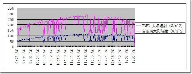 結果表明這種薄膜鍍層對減少經過玻璃被傳輸的太陽輻射熱方面有著明顯的效益。 下面的圖 1 為測試的數天中一個典型的數據(2010年7月11日)。在 11:42時,太陽輻射達到峰值接近300 W/平方米,。 在太陽輻射峰值時,貼有窗膜的玻璃上記錄下的數據是110 W/m2。這表明由于窗膜的采用通過玻璃傳入室內的太陽輻射熱量減少了60%。