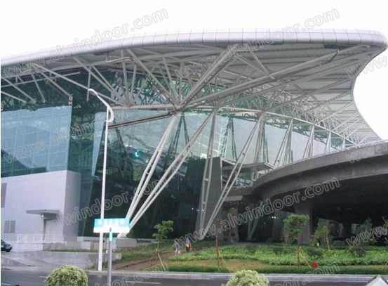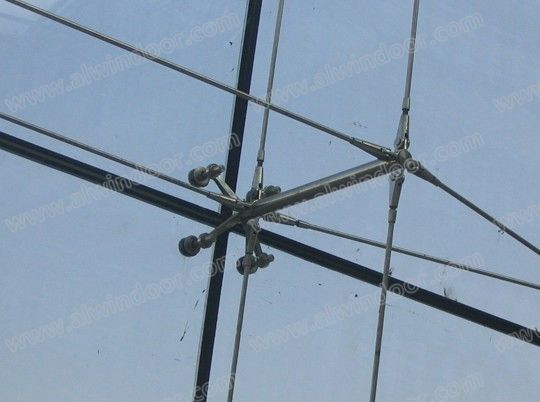 點駁接式玻璃幕墻采用輕金屬框架結構和金屬索機構,利用金屬駁接爪,把玻璃固定在金屬框架上。點駁接玻璃幕墻結構通透,視覺效果好,近些年主要使用在大型公共建筑中。機場、博物館、展覽館、酒店大堂。點駁接玻璃幕墻的缺點是節能效果差,不利于現代建筑節能。點駁接工程的玻璃可以做成曲面,以適應現代建筑的復雜設計構造和曲面特殊要求。