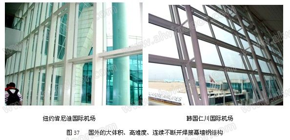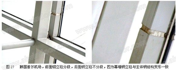 韓國首爾仁川機場幕墻就是一個最典型的例子,幕墻玻璃由鋁立柱和鋼立柱共同支承,鋼立柱與主體鋼結(jié)構(gòu)直接連接。由于鋁材變形遠遠大于鋼材,與鋼立柱無法協(xié)調(diào),所以鋁立柱分段;而鋼立柱與主體鋼結(jié)構(gòu)變形相同,所以鋼立柱不必分段(圖27)。