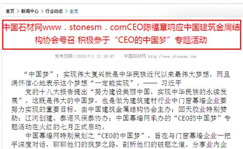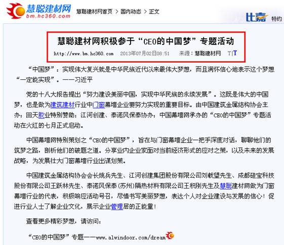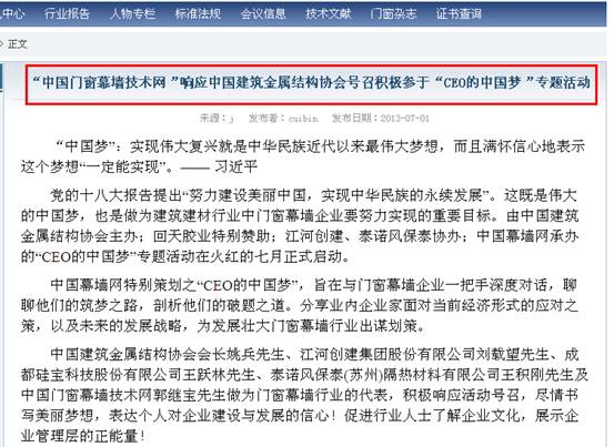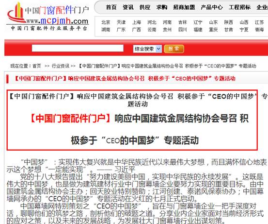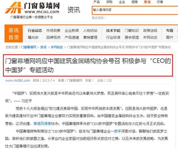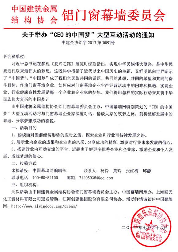 CEO的“中國(guó)夢(mèng)”活動(dòng)自2013年7月開始,得到主辦方“中國(guó)建筑金屬結(jié)構(gòu)協(xié)會(huì)”及協(xié)辦方“上海回天膠業(yè)化工新材料有限公司”、“江河創(chuàng)建集團(tuán)股份有限公司”的大力支持與協(xié)助,經(jīng)過四個(gè)多月的精心策劃籌備、宣傳推廣和廣泛征稿,組委會(huì)共計(jì)收到來稿作品132件,根據(jù)參賽規(guī)則的審核,最終產(chǎn)生有效稿件:129件(協(xié)會(huì)領(lǐng)導(dǎo)、行業(yè)專家:15件,CEO:39件,區(qū)域經(jīng)理:23件,企業(yè)推薦客戶代表:52件)。中國(guó)建筑金屬結(jié)構(gòu)協(xié)會(huì)會(huì)長(zhǎng)姚兵先生、上海回天膠業(yè)化工新材料有限公司董事長(zhǎng)章峰先生、江河創(chuàng)建集團(tuán)股份有限公司劉載望先生、泰諾風(fēng)保泰(蘇州)隔熱材料有限公司王積剛先生等作為門窗幕墻行業(yè)的代表,積極響應(yīng)活動(dòng)號(hào)召,盡情書寫美麗夢(mèng)想,表達(dá)個(gè)人對(duì)行業(yè)發(fā)展與企業(yè)建設(shè)的信心!
