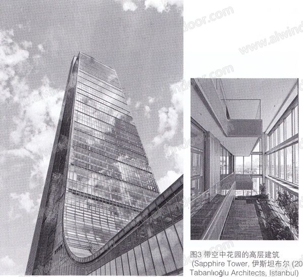 中庭、涼廊和玻璃空中花園[6]與雙層幕墻(圖3)目的相同,也可整合進動態型、控制型和認知型建筑系統。在辦公樓里,它們可作為臨時公共區域,或在高層中作為臨時的延伸居所。如果外層幕墻配備隔熱玻璃和電動開啟件,可增加整個幕墻的使用壽命。