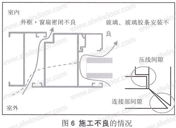 冬季外框的保溫結構和夏季的隔熱結構可以在設計上得到確保,但窗的性能基本上依靠外框和窗扇之間的密封材的緊密連接來保障,施工品質對窗的氣密性起到重要作用。如果施工不良,不僅熱量會從框、扇間隙流出,而且會造成沙塵、花粉等的侵入,污染室內環境。(圖6)。