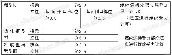 支承構(gòu)件型材截面厚度是關(guān)系幕墻結(jié)構(gòu)安全和材料用量的技術(shù)經(jīng)濟(jì)綜合指標(biāo)。根據(jù)鋼結(jié)構(gòu)和鋁結(jié)構(gòu)設(shè)計(jì)規(guī)范和工程經(jīng)驗(yàn),《人造板材幕墻規(guī)范》作出下列表4規(guī)定:
