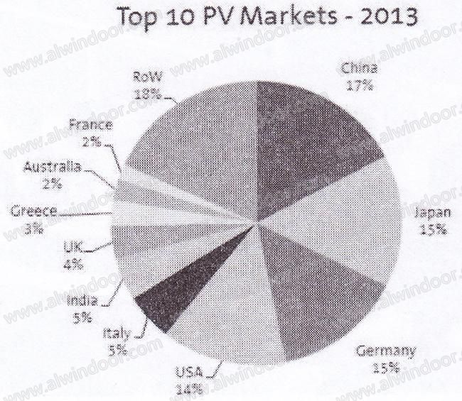 國外資料顯示:2012年全球光伏安裝量達31.4GW,較前一年提高14%。預計2013年全球光伏安裝量超過35GW,中國為17%,日本、德國分別為15%,美國為14%。印度、意大義分別為5%,英國為4%,希臘為3%,澳大利亞為2%,世界其它地區為18%。