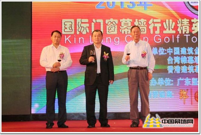 中國建筑金屬結構協會鋁門窗幕墻委員會副秘書長主任黃圻(左)、廣東堅朗五金制品股份有限公司總裁白寶鯤(中)、中國建筑金屬結構協會顧問杜宗翰(右)共同舉杯慶祝高爾夫球賽的圓滿成功 圖9