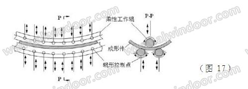 如圖17所示,待成形件夾持于工作輥之間,工作輥在驅(qū)動(dòng)機(jī)構(gòu)作用下同步轉(zhuǎn)動(dòng),帶動(dòng)工件產(chǎn)生進(jìn)給運(yùn)動(dòng),通過增加或者減少柔性輥沿軸線方向各環(huán)節(jié)的壓下量,使工作輥滾壓板料,從而使板料產(chǎn)生縱向與橫向塑性變形。此成形方式的具體控制方式及實(shí)際應(yīng)用,筆者未曾深入了解,此處不做過多稱述。