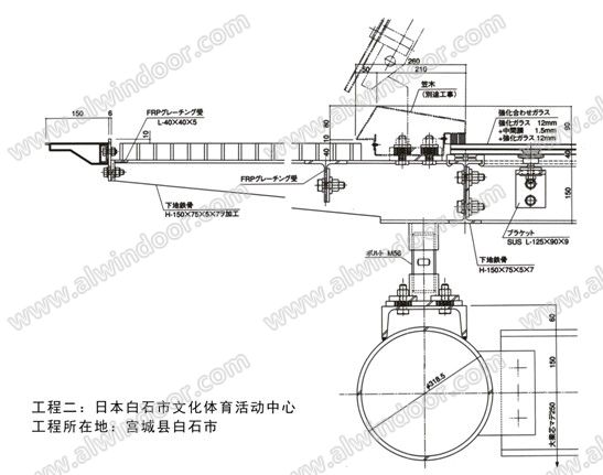 這是一個橢圓型觀光步行的玻璃(幕墻)大屋頂,長約106米,最大跨度36米,離地面高度14米,上下部設計有玻璃的欄桿、展望步行廊、在這一具大的玻璃(幕墻)大屋頂上,還設計配有各種各樣的噴泉。在玻璃(幕墻)大屋頂下面的回廊有4根大柱子,在上面用彎曲的鋼管,通過鋼梁架架設在主體結構之上,以保持足夠強度。屋頂主面采用12㎜+中間膜1.5㎜+12㎜的夾膠鋼化玻璃,走廊均為乳白色,水盤采用透明中間膜,使地面陽光閃閃搖動。H鋼的翼緣面把橡皮條遮蓋,安裝的鐵腳通過DPG構法來支持。固定鐵件藏在夾膠玻璃后面,使之不外露。考慮到配合間的間隙不用硅膠,采用條形橡皮條,橡皮條在工場中做成梯子狀,施工時使各個板塊間連結成一條,因沒打硅膠,侵入的水在橡皮條外圍的槽進行排水。該玻璃(幕墻)的性能:耐風壓±280kgf/㎡(玻璃承載負荷),面內變形1/300無需修補,面變形成1/200無破損、殘留變形(只需硅膠補修)、1/100無破損、脫落。