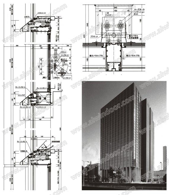 該幕墻工程強調縱向外觀設計的單元幕墻,柱部用帶有化粧扣的鋁蜂窩型線圈覆蓋,從上段到下段單元幕墻基本尺寸:W2700×H4000。間隙部全部采用開放式間隙構法。板塊縱襯用鐵腳固定在鋼體上,鐵腳與鋼體用拉鏈固定。板塊分格下框內藏有自然換氣裝置,分格間就可自然換氣,化粧扣外加有吊籃引導滑輪。拱局、分格部采用8㎜厚單板玻璃,玻璃為紅外線反射玻璃,板塊搬入后,在現場安裝,皮條部位安橡皮條,板塊施工后,室內側注打結構膠。