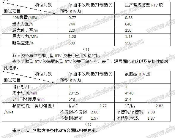 例c使用醇型膠雙效助劑制作膠料,其方法如下:取100份常用的聚二甲基硅氧烷,加入85份經脂肪酸處理的沉淀法白炭黑(比表面積為32m2/g),0.6份醇型膠雙效助劑,0.2份鈦酸酯混合成膠料,裝入密封筒中保管,而后擠出亦用于粘接銅、鋁、聚氯乙烯及ABS等物料。