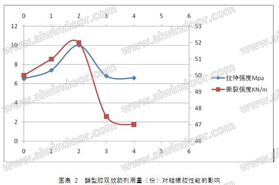醇型膠雙效助劑用量對硅橡膠的物理力學性能影響 圖(2)為醇型膠雙效助劑用量對硅橡膠物理力學性能的影響,基本配方:生膠(HO(Me2SiO)nH)100份,白炭黑40份,85份碳酸鈣,0.2份的鈦酸酯,硫化條件20℃30%的相對濕度,硫化時間24h。其中,視樣品的不同,生膠中的醇型膠用量各異。