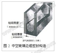 單道密封的中空玻璃適用壽命很短,可見內層密封的重要性。丁基密封膠濕氣透過率≤1 g/m2•d,邊緣粘結寬度(滲透通道寬度)約7mm,粘結厚度(滲透路徑長度)0.3~0.6mm(圖2)。濕氣滲透速度取決于丁基密封膠的濕氣透過率和粘結厚度,如若按粘結厚度0.6mm計算,濕氣滲透致使中空玻璃飽和吸濕的理論年限超過30年。建筑中空玻璃早期失效的影響因素較多,高溫、高濕環境的作用是顯著因素,高濕度增大水蒸氣擴散滲透壓,高溫提高中空玻璃內部氣壓使面板撓曲變形拉伸膠縫 ,即擴大滲透面積,加速濕氣滲透。有必要通過試驗測定其量化關系。