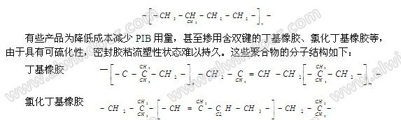 密封膠的工藝性能和密封性能取決于產品配方組成。丁基密封膠的基膠是液態聚異丁烯(PIB),狀態為黏性流體,分子量4~9萬,用量一般在40%以上。PIB是非晶態碳-碳主鏈均聚物,不含雙鍵,永不固化,具有與石蠟類碳氫化合物相近的化學惰性,賦予丁基密封膠優異的耐化學腐蝕穩定性,耐氣候、熱和浸水老化,對空氣、濕氣和其他氣體滲透率極低,甚低表面能使其對PE、EPDM等難粘性材料浸潤和觸粘,玻璃化溫度極低(-60℃),能隨外力作用塑性流動反復變形,但是由于PIB溶于烴類溶劑,丁基密封膠不耐油。聚異丁烯分子結構如下: