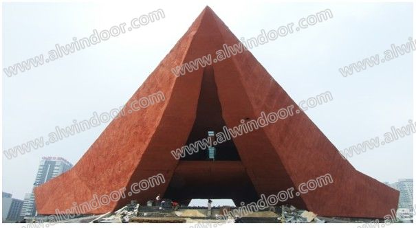 辛亥革命博物館,總建筑面積2.2萬平方米。倍立達在該項目中,使用表面為天然石紋質感的幕墻板1.24萬㎡,板塊凹凸控制為200mm,單塊模具面積達700㎡,幕墻GRC應用了納米光催化技術,使GRC具備了彌久如新的自潔特性。建筑整體設計結合了中國傳統建筑風格和現代表現手法,在鮮明的“楚國紅”基色烘托下,凸顯了“石破天驚”的建筑創意,展示了辛亥革命劃時代的歷史功績。