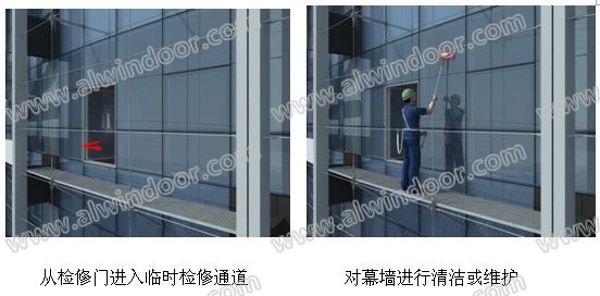 制作一組6~7個鋁合金格柵踏板即可,輪換使用,清洗人員擦洗到哪里就安裝到哪里,直到此層篆字幕墻的另一端,不需要每層滿鋪。需進(jìn)行清洗和維護(hù)工作時,可卸下玻璃幕墻上的上懸窗撐桿,取消上懸窗的開啟限位,通過懸窗進(jìn)入兩層幕墻間的檢修通道。篆字幕墻及篆字后的玻璃幕墻的維護(hù)或者玻璃破損后的更換都可以使用本方案。