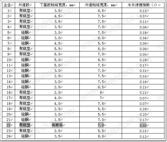 玻璃企業,相對國內產品的技術水平具有一定的代表性。已知各組試件的密封膠類型,測定了試件外層密封的粘結寬度和